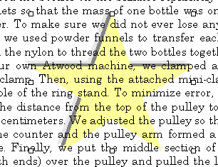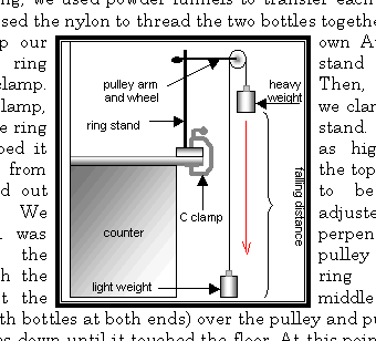 First, group all the components of the graphic together. For beginners, you should group together subjects (the ring-stand, the pulley and weights, the counter and countertop). Then you can group all the sub-objects together along with the text to create only one object. Now you should be able to move the figure around as one. An easy way to select multiple objects for grouping is to use the select objects tool in the drawing toolbar (refer to drawing toolbar page). Simply draw a rectangle around the object you want selected. You can deselect objects from a group of selected objects by holding shift and clicking on the object you wish to deselect.